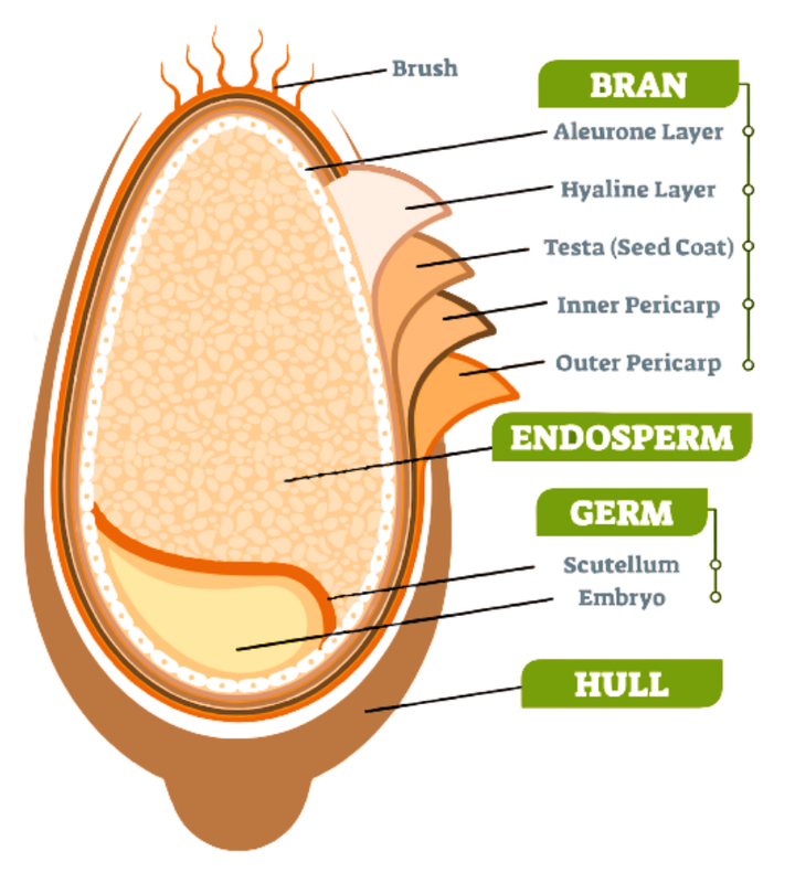 Surrounding the kernel is the hull, sometimes called the husk. It’s a tough, inedible outer casing that protects the grain from pests and moisture while it grows in the field. During milling, the hull is removed and not used in flour production. Its thickness and texture vary between grain species — for example, spelt and barley have more tightly adhering hulls than modern bread wheat — which is why some grains require additional mechanical steps to de-hull before milling.