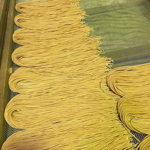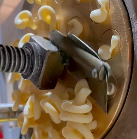 L’Abruzzese extrude their pasta through Bronze Dies, giving the surface of the pasta microscopic roughness and almost white surface. Mass-market brands choose to extrude through Teflon because it's faster (the pasta is extruded 3-4 times faster) and thereby more economical. However, it produces unwanted heat on the surface of the pasta, damaging the dough, affecting the texture and the flavour.