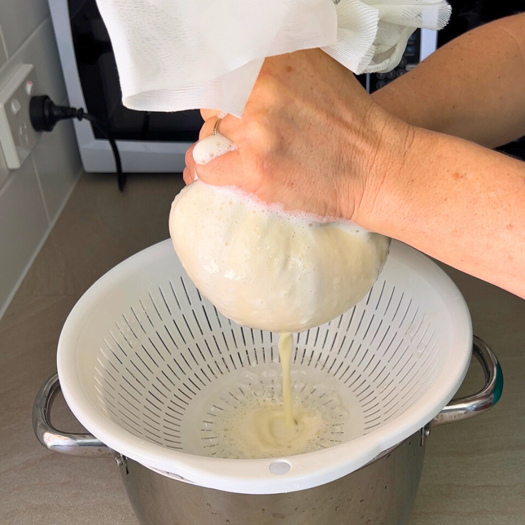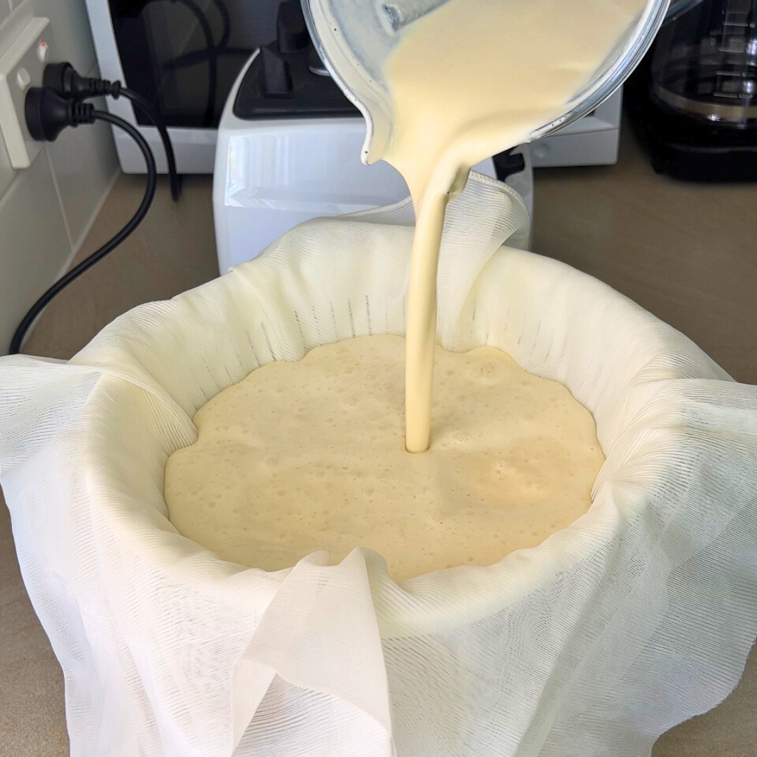 You will now be left with raw soy milk in the pot (don’t drink it yet!) and the dry soy pulp - also called ‘Okara’. Store Okara in the fridge or freezer for use in other recipes (this is one example) or add to compost.