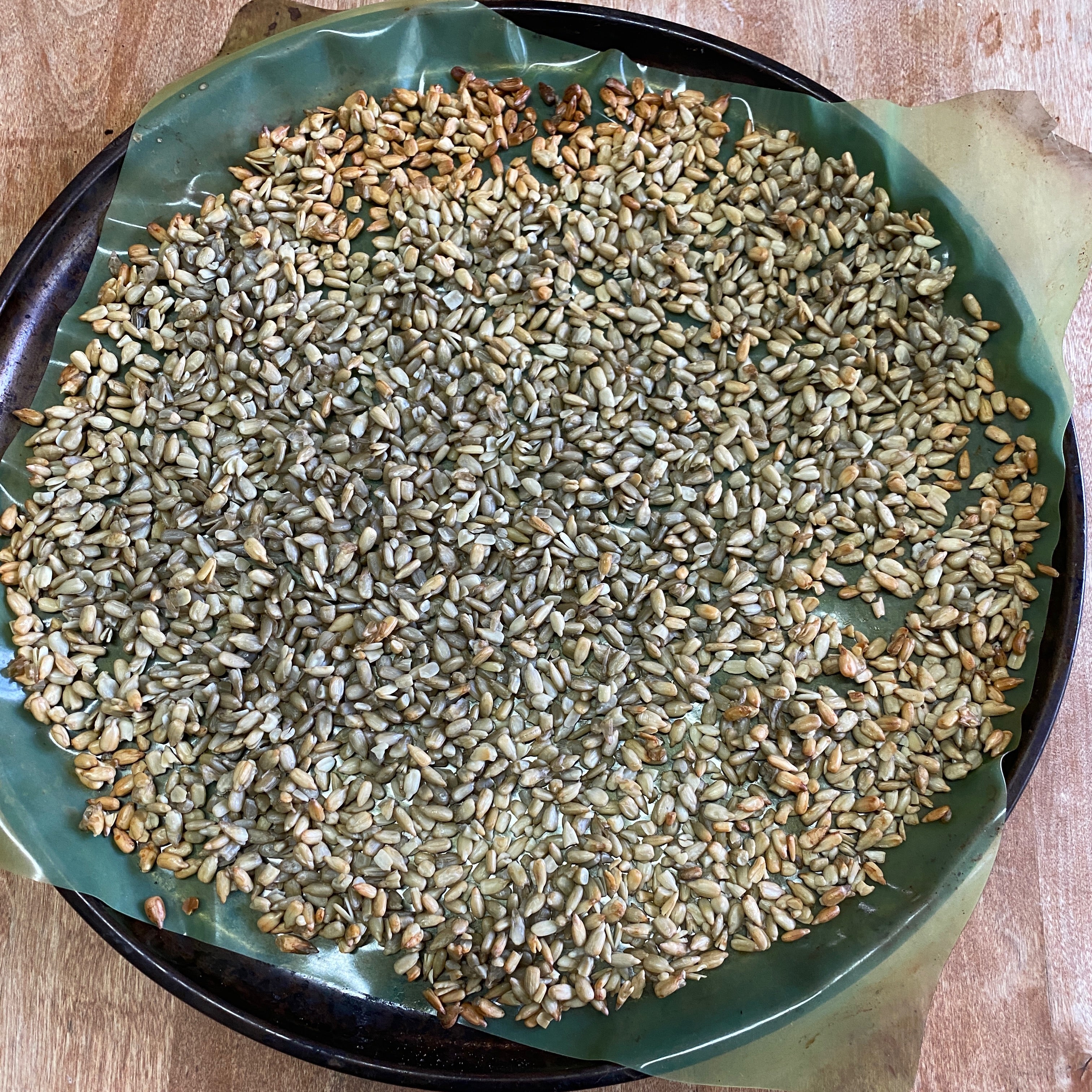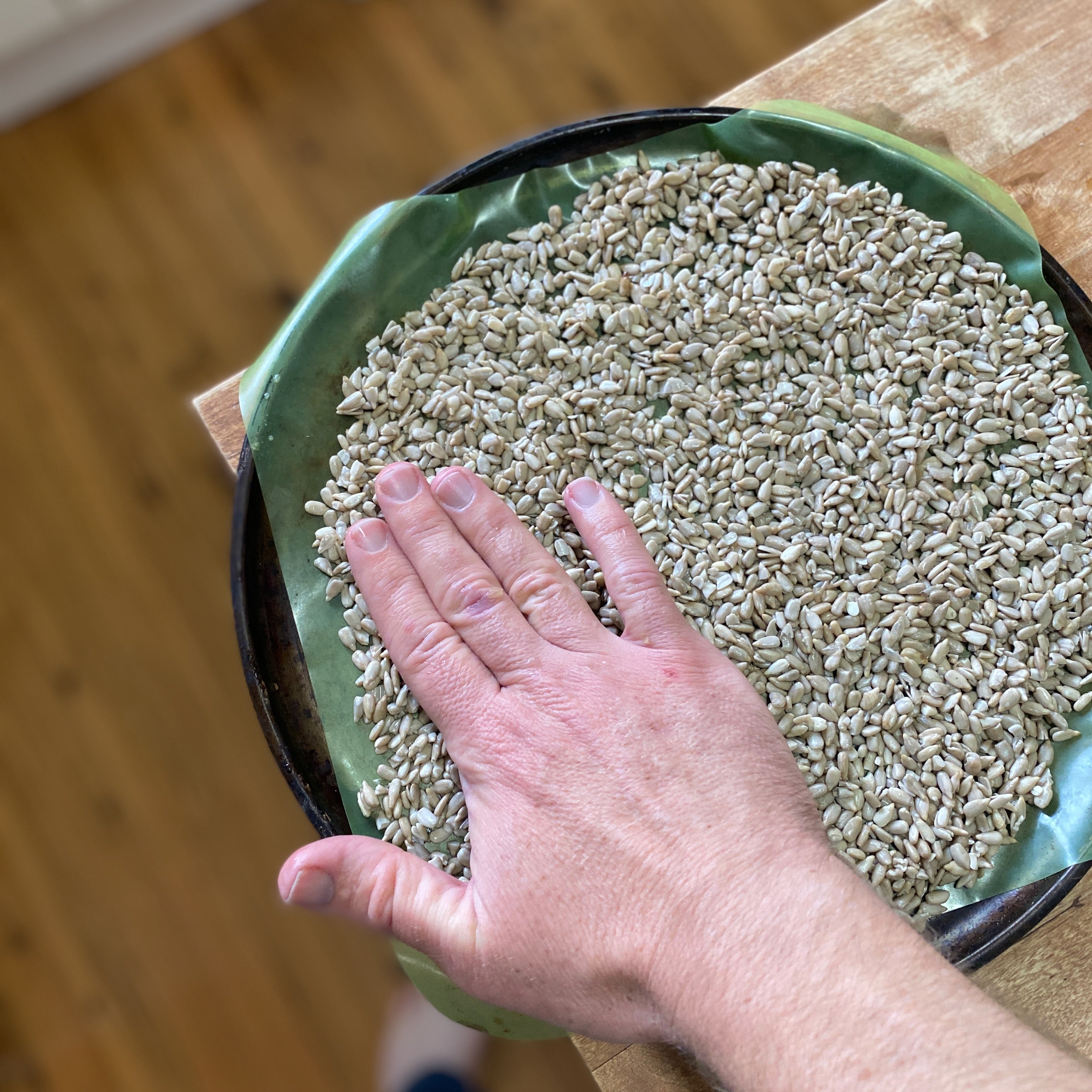 Spread the sunflower seeds in a single layer on the lined baking and place it in the oven (for this recipe, you will need two 30cm trays)