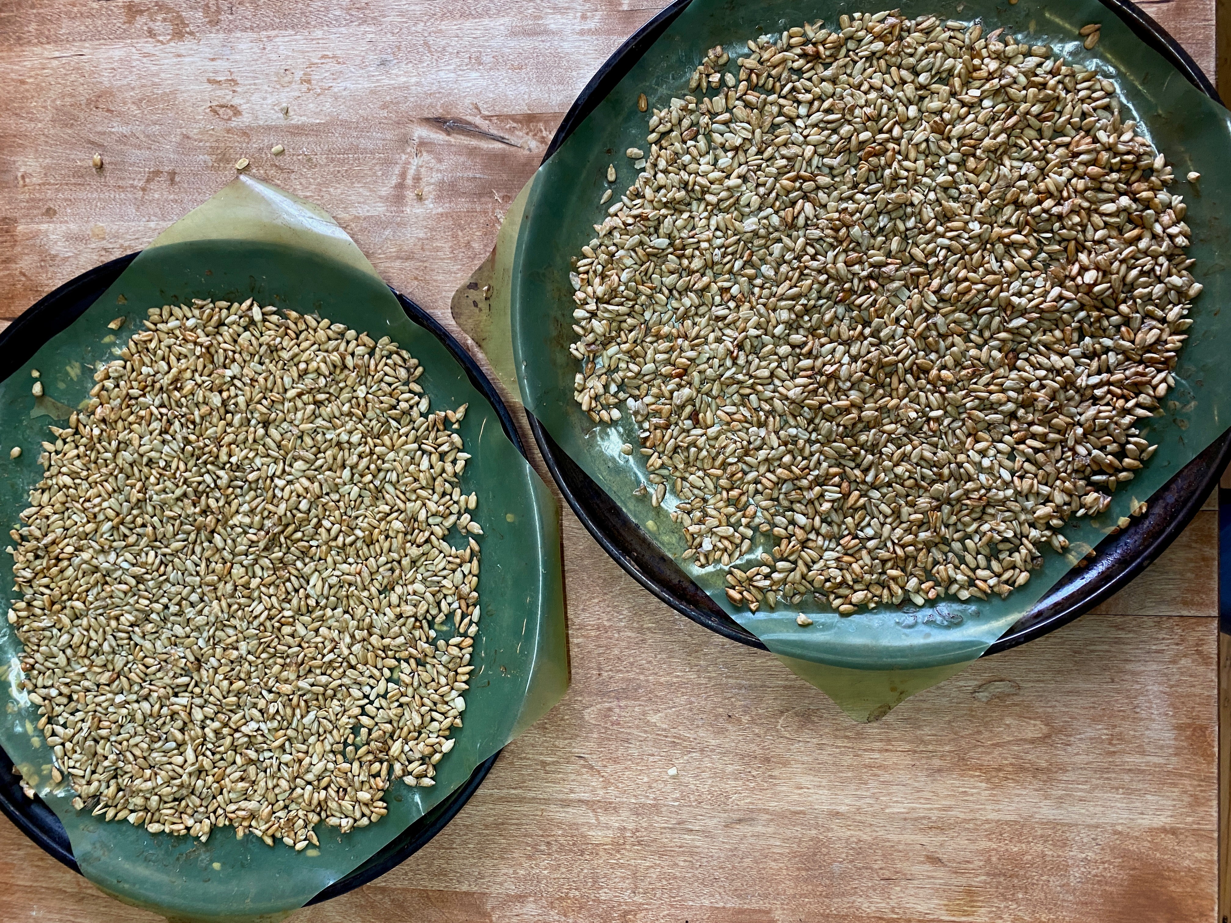 Check after 10 minutes, toss the kernels, and give the tray a shuffle, so they toast evenly.