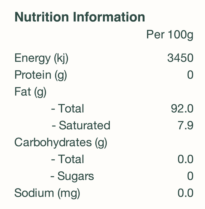 Pecan oil is high in monounsaturated fats, similar to extra virgin olive oil, but with a more delicate flavour and a cleaner finish. Because the pecans are grown, cracked, dried, sorted, pressed and filtered on farm, the time between harvest and oil production is short. This protects the integrity of the natural oils and preserves that buttery, aromatic quality; reducing the chance of "off notes" in the oil.